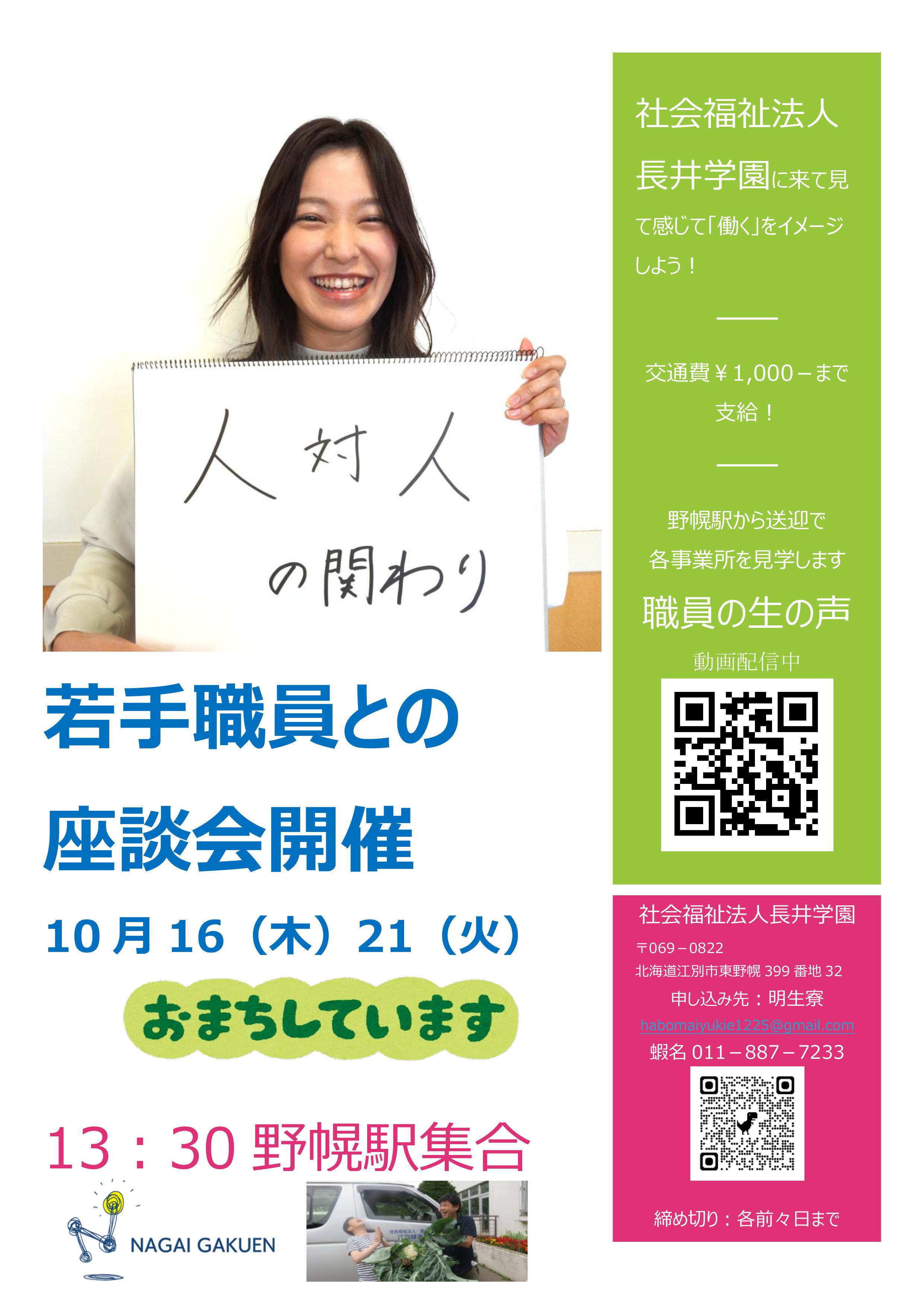 ◇ 令和7年6~7月「ガクチカ」つくりにおいでよ! 開催します ◇ 令和7年4月23日~「ガクチカ」つくりにおいでよ! 開催します 詳しくはこちらPDF 令和7年4月23日「ガクチカ」つくりにおいでよ!第1弾 開催しました 2025年 ◇ 「福祉のしごと就職フェア」 参加します 開催日時 令和7年3月2日(日)10:00~15:00 会場 札幌ビューホテル大通公園 専用ホームページURL https://hfjc.jp/briefing/r6fea/ 2024年(中途採用) ◇ 「介護補助のお仕事説明会」 参加します 開催日時 令和6年12月13日(金) 会場 かでる2.7 専用ホームページURL https://hfjc.jp/briefing/hojyosetumeikai/ 2024年(新卒採用) ◇ 令和6年6月27日札幌学院大学にて福祉の仕事についてパネルディスカッション |